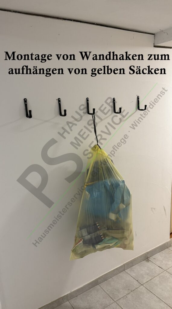 Montage von Wandhaken zum aufhängen von gelben Säcken
